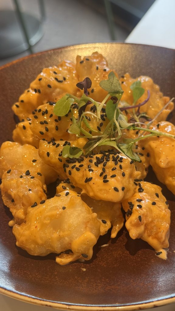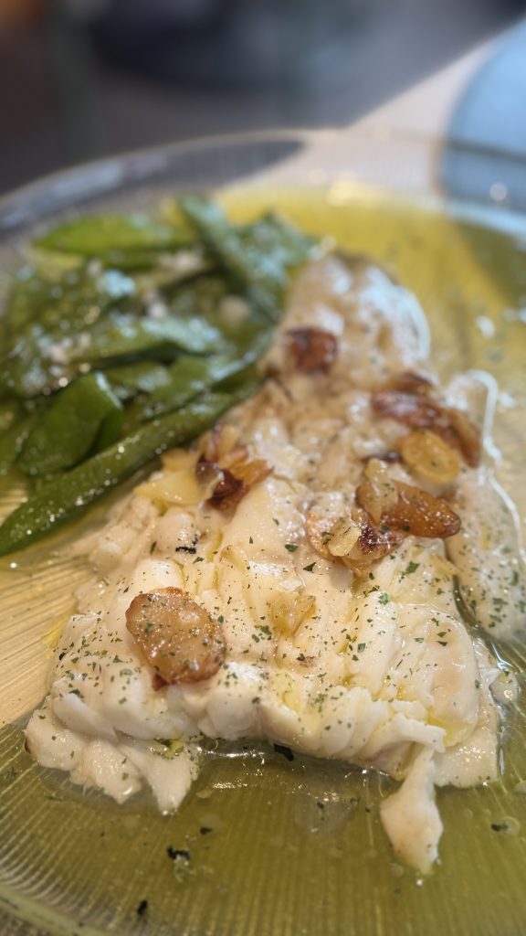 Los platos de cuchara son uno de los puntos fuertes de El Albero Becerril y en esta ocasión Inma nos sugirió la cazuela de alubia roja con matanza que prepara Mocho con los mejores ingredientes y grandes dosis de cariño. Un rotundo acierto que nos conquistó desde la primera cucharada y que dio paso a una divertida tempura de langostino tigre con un ligero toque picante. Un plato que resulta perfecto para compartir y que desembocó en un exquisito bacalao skrey que preparan a la brasa con tirabeques. Una materia prima de primerísima calidad que elaboran con esmero y que sin lugar a dudas merece la pena probar cuando lo tienen.